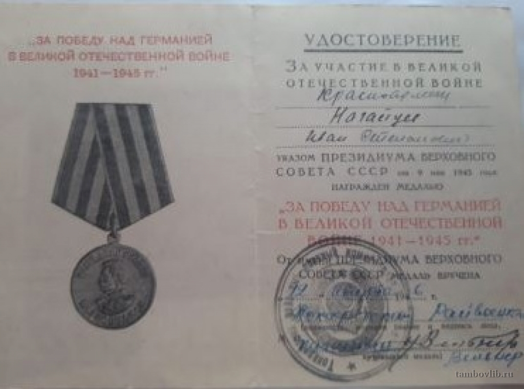 Удостоверение «За победу над Германией в Великой Отечественной войне 1941-1945 гг.» Нагайцева Ивана Степановича.