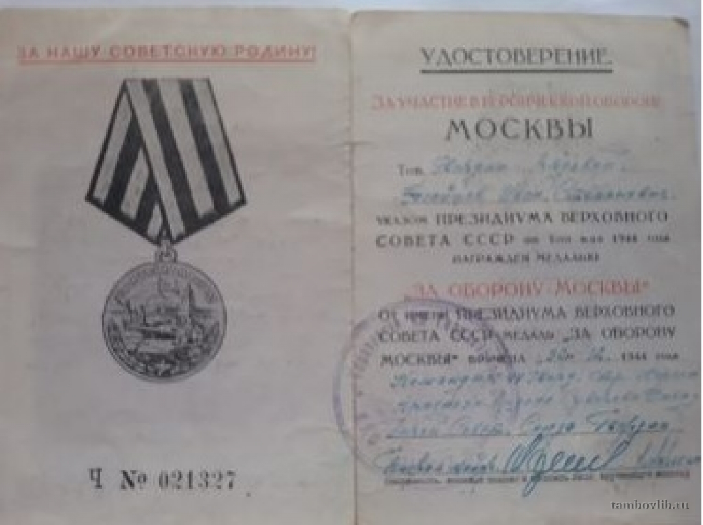 Удостоверение к медали «За оборону Москвы» Нагайцева Ивана Степановича.