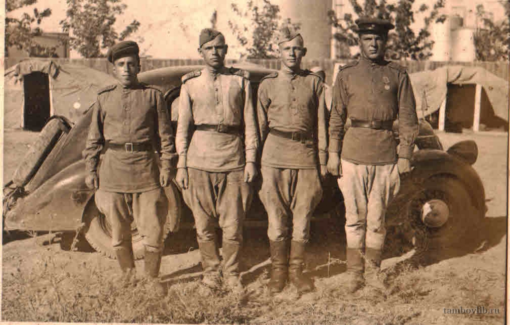 Родился 22 сентября 1924 г. в д. Абаносимово Новосельцевского с/совета Покрово-Марфинского района Тамбовской области. 31 августа 1942 г. был направлен в г. Городище Пензенской области в школу младших командиров Покрово-Марфинским райвоенкоматом Тамбовской области. В феврале 1943 г. закончил учебу во 2-ом учебном полку курсантом и был направлен на Степной фронт, в последствии переименован во 2-ой Украинский фронт. Был направлен в 52 дивизию в 439 стрелковый полк командиром отделения 1 батальона. При взятии Харькова 26 августа 1943 г. получил ранение в левую ногу. Был направлен в полевой госпиталь. Был выписан в октябре 1943 г. и назначен командиром отделения 976 зенитного полка. В ожесточенных боях с фашистскими захватчиками за взятие г. Полтава был ранен в грудную клетку. 14 ноября 1943 г. был направлен в госпиталь г. Полтавы. В феврале 1944 г. был выписан и направлен в 714 стрелковый полк командиром орудия 45 мм. Известие о Победе 9 мая получил в г. Вена, Австрия. Был демобилизован 25 марта 1947 г. Награжден орденом «Красной Звезды», медалью «За Победу над Германией». На фото крайний слева.22 сентября 1945 ТОУНБ Портрет
