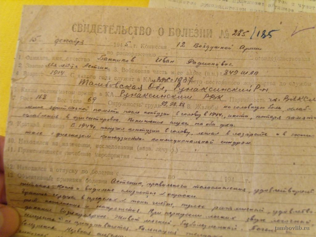 Родился 12.01.1914 г. в с. Башкировка Ржаксинского района Тамбовской области. Был призван в ряды Красной Армии в сентябре 1939 г. Служил в звании младшего лейтенанта, летчик 849 штурмового авиационного полка, 445 бомбардировочного авиационного полка, 49 района авиационного базирования. В 1944 г. был контужен в голову, лежал в лазарете и госпитале. Дата окончания службы 1946 г. После войны работал главным бухгалтером. Награжден медалями «За победу над Японией», «За победу над Германией в Великой Отечественной войне 1941-1945 гг.» и орденом «Отечественной войны II степени».15 декабря 1945 ТОУНБ Документ