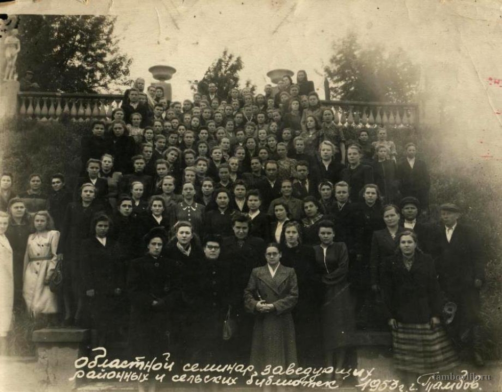 Среди участников областного семинара находится заведующая Инжавинской районной библиотекой Козина Екатерина Никитична (в третьем ряду третья справа). Фотография предоставлена из семейного архива.1953 Межпоселенческая центральная библиотека Инжавинского района Портрет Тамбов, Тамбовская область, Россия