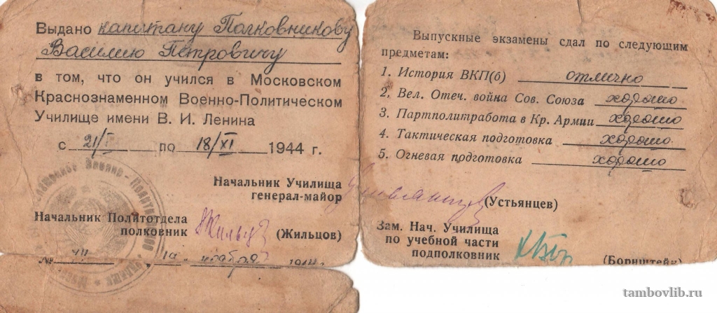 Свидетельство выдано капитану Полковникову Василию Петровичу.19 ноября 1944 Знаменская ЦБС Документ