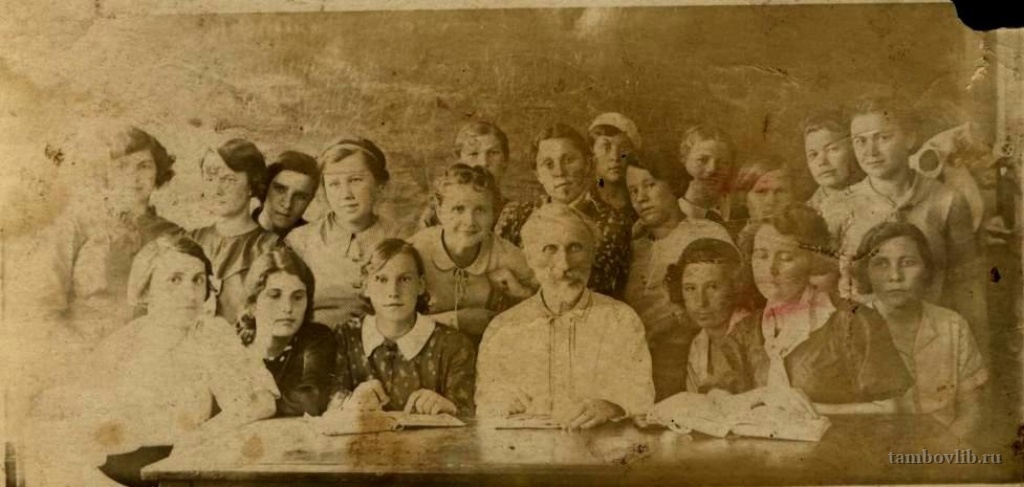 Екатерина Никитична Козина (Юмашева) (сидит вторая слева) среди студентов 1 и 2 курса естественно-географического отделения педагогического института с преподавателем генетики и дарвивизма В. Е. Карандеевым. Екатерина Никитична Козина на протяжении многих лет была директором Инжавинской районной библиотеки. Фотография из семейного архива.Межпоселенческая центральная библиотека Инжавинского района Портрет Тамбов, Тамбовская область, Россия