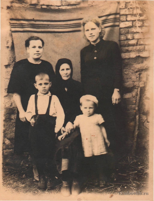 На фото: в центре сидит Любовь Бирюкова, справа - её дочь Александра Николаевна (участница Великой Отечественной войны) с дочерью Люсей; слева - сноха Мария Яковлевна с сыном Вовой. Фото из семейного архива Полковниковых.1947, июнь Знаменская ЦБС Семейное Россия, Тамбовская область, Знаменка