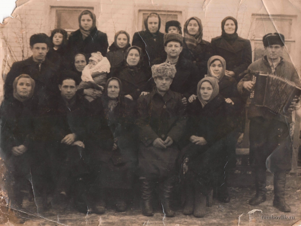 Фото сделано во время приезда в с.Рысли родственника - Ивана Сарычева из Благовещенска. На снимке он сидит в центре. Из личного архива Пелагеиной (Сарычевой) Алевтины Петровны, на фото она стоит в верхнем ряду третья слева.1955 Знаменская ЦБС Семейное Село Рысли Моршанского района Тамбовской области.