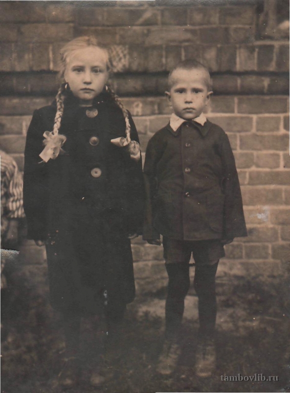 На фото: Сарычева Аля (7 лет) и её брат Виталий (5 лет). Сарычева Алевтина Петровна (в замужестве Пелагеина) в 1965 году окончила Моршанский библиотечный техникум. 42 года отдала библиотечному делу. Почти 30 лет работала заведующей отделом обслуживания Знаменской центральной библиотеки.1953 Знаменская ЦБС Семейное Село Рысли Моршанского района Тамбовской области