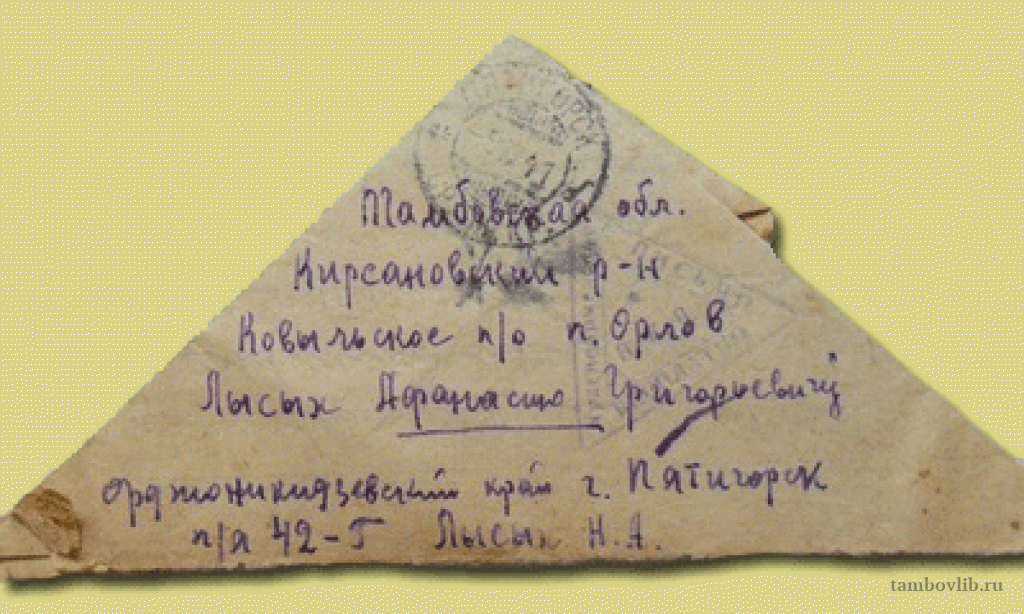 Первое письмо - треугольник Николая датированы октябрем 1941 года. Вначале была учеба в Пятигорске, их учат десантному делу, связи. Он пишет о красотах гор Машук и Бештау, посылает карточки и одну из них с видом Эльбруса просит сохранить ему на памятьКирсановская городская библиотека Письмо
