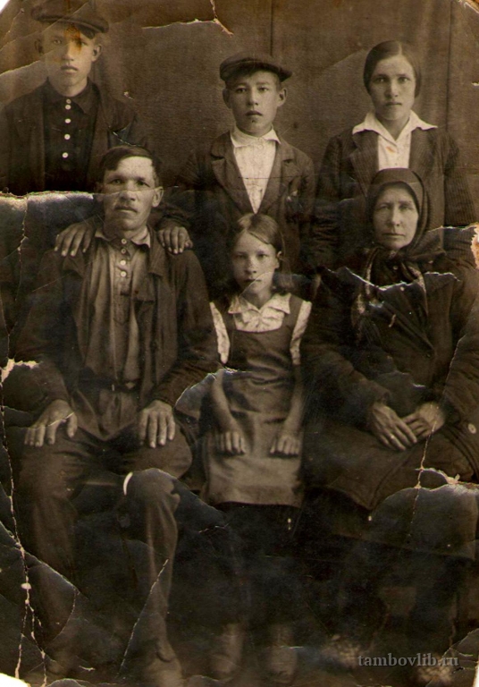 Глава семьи - Горбунов Семен Матвеевич (1899 г.р.), его жена - Горбунова Анна Гавриловна, дочери - Татьяна (стоит справа) и Мария (в центре), сыновья - Иван и Алексей. Горбунов Семен Матвеевич - участник Великой Отечественной войны, погиб в марте 1942 года. Занесен в Книгу Памяти (Сосновский район). Горбунов Иван Семенович (1923 г.р.) - участник Великой Отечественной войны. Призван в армию в 1941 г., демобилизовался в 1947 г., рядовой. Горбунов Алексей Семенович (1926 г. р.) - участник Великой Отечественной войны. Призван в армию в 1944, демобилизовался в 1950 г. Фотография предоставлена Бидыло Ф. Е. (р.п. Инжавино)1939 Межпоселенческая центральная библиотека Инжавинского района Семейное с. Старое Грязное Сосновского района