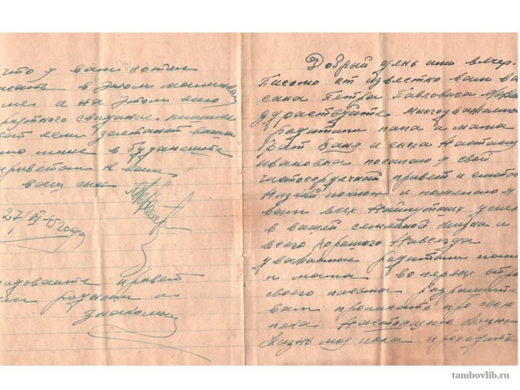 Из семейного архива Монетовых, предоставлено Г.И.Монетовой, библиотекарем Скачихинской модельной библиотеки.27 января 1945 Межпоселенческая библиотека Уметского района Письмо Скачиха, Тамбовская область, Россия, 393146