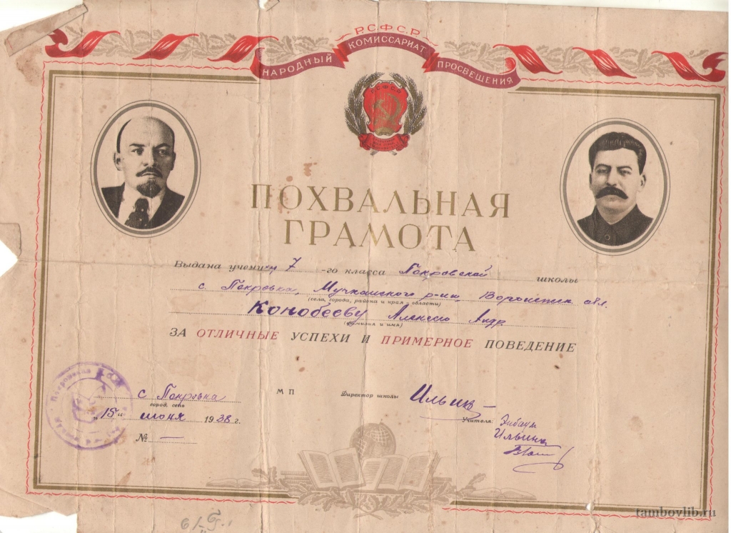 Документ из семейного архива Конобеевой Марии Васильевны.1938 Центральная библиотека Мучкапского района Документ