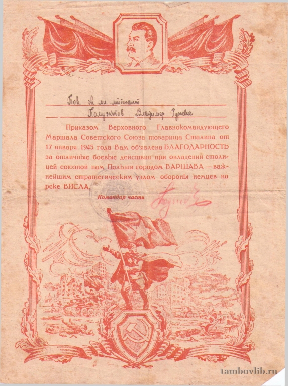 Из музейной комнаты МБУК "Межпоселенческая центральная библиотека Пичаевского района"17 января 1945 Межпоселенческая центральная библиотека Пичаевского района Документ