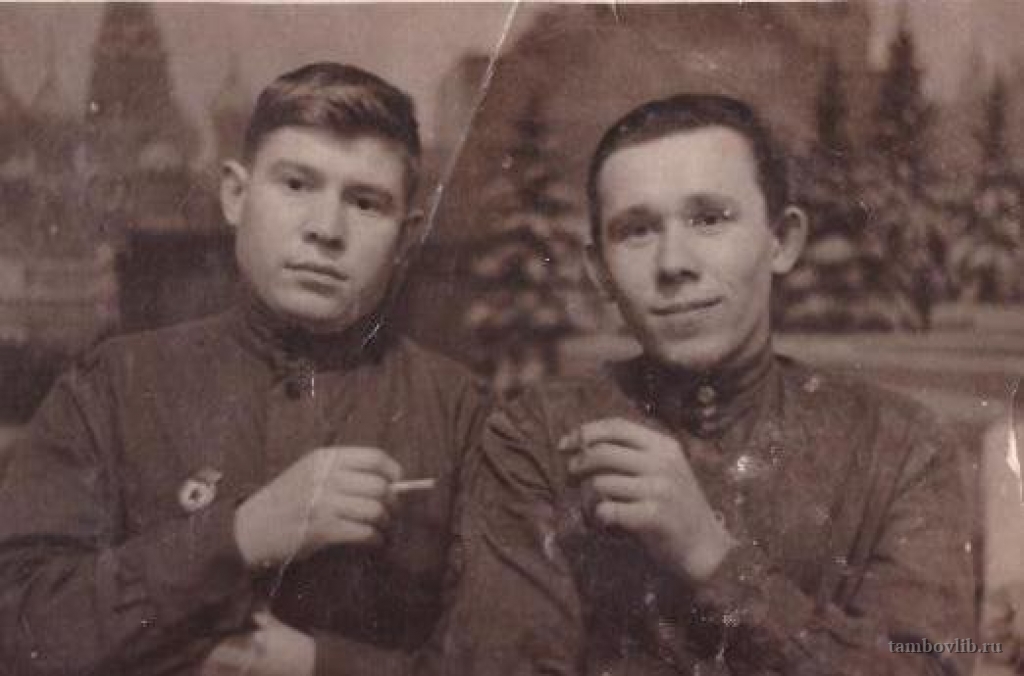 Власов Александр Павлович,родился 1921году в с.Голынщина Кирсановского района.Призван в армию в 1941г. Умер в 2005г. На фото с другом.Районная библиотека Кирсановского района Портрет