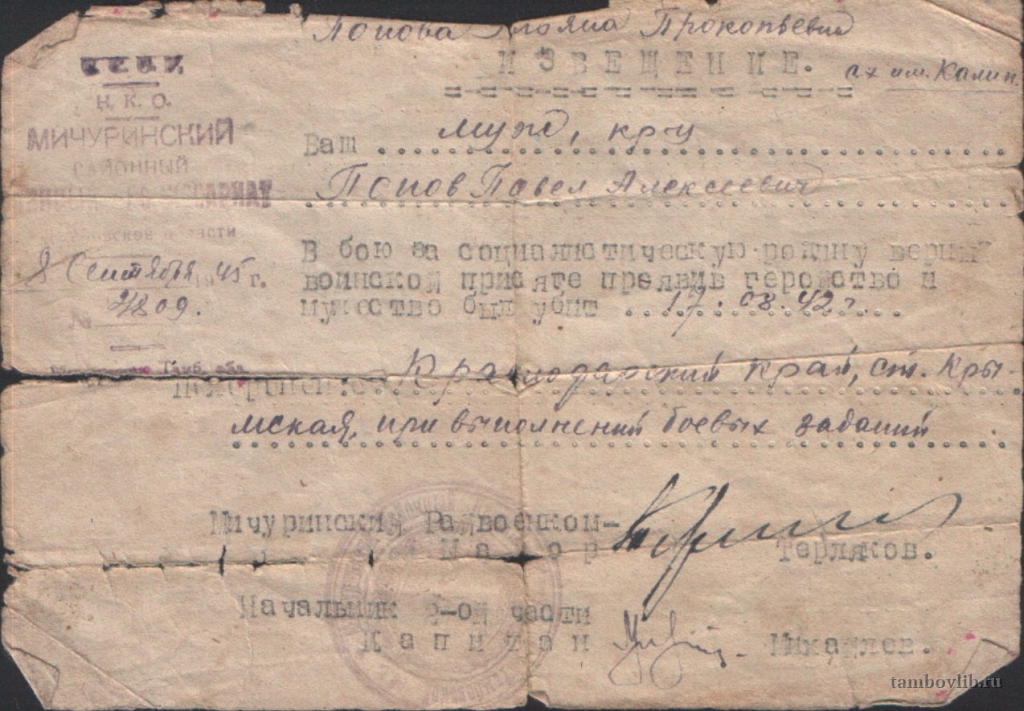 Попов Павел Алексеевич родился в с. Лапино Мичуринского района. Погиб летом 1942 г., похоронен в г. Крымск.08 сентября 1945 Межпоселенческая центральная библиотека Жердевского района Документ