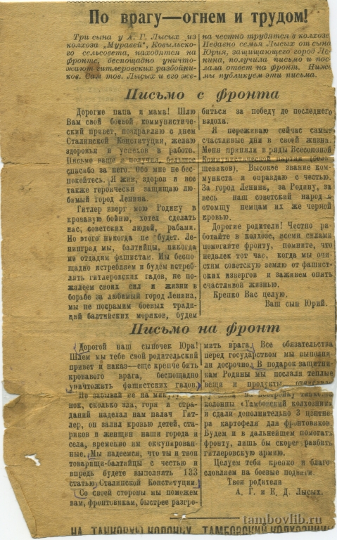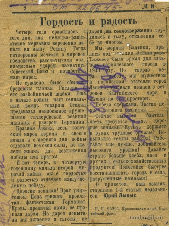 А от Юрия Афанасьевича Лысых есть еще одно опубликованное в этой же районной газете письмо. Но обращается старшина 1-й статьи, медаленосец уже к своим землякам. Датирована эта статья 22 июня 1945 года. И называется она «Гордость и радость» — это все, что имеется от дяди со времен войны. Но мы бережем бесценные заметки, они пожелтели, порвались во многих местах. Газета в далеком 1945 году переходила из рук в руки по всему поселку Орлов, что на Тамбовщине.