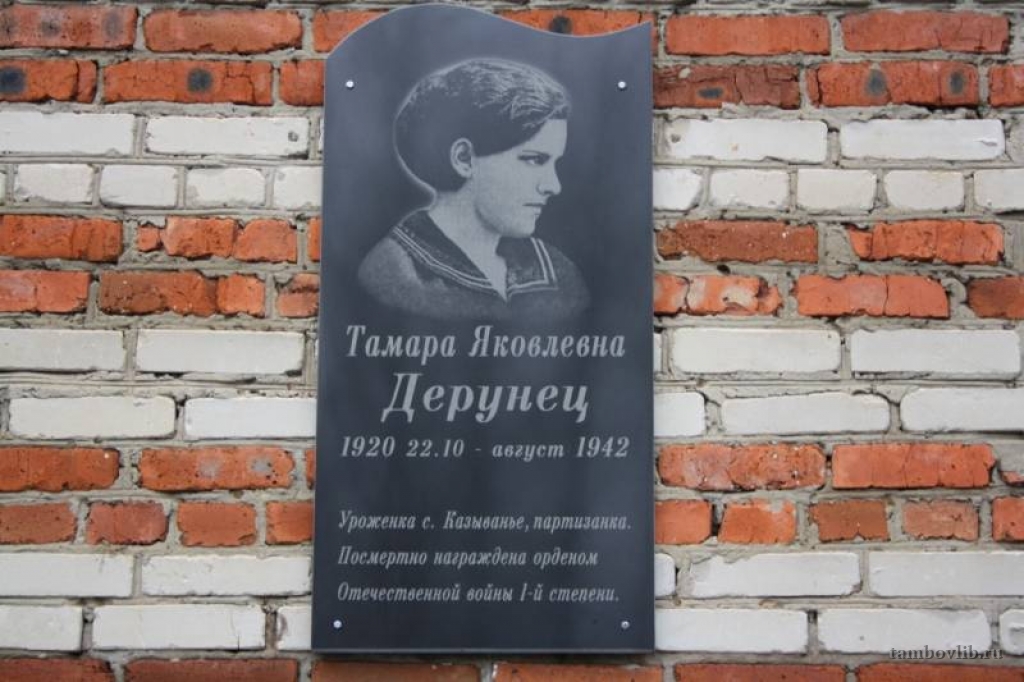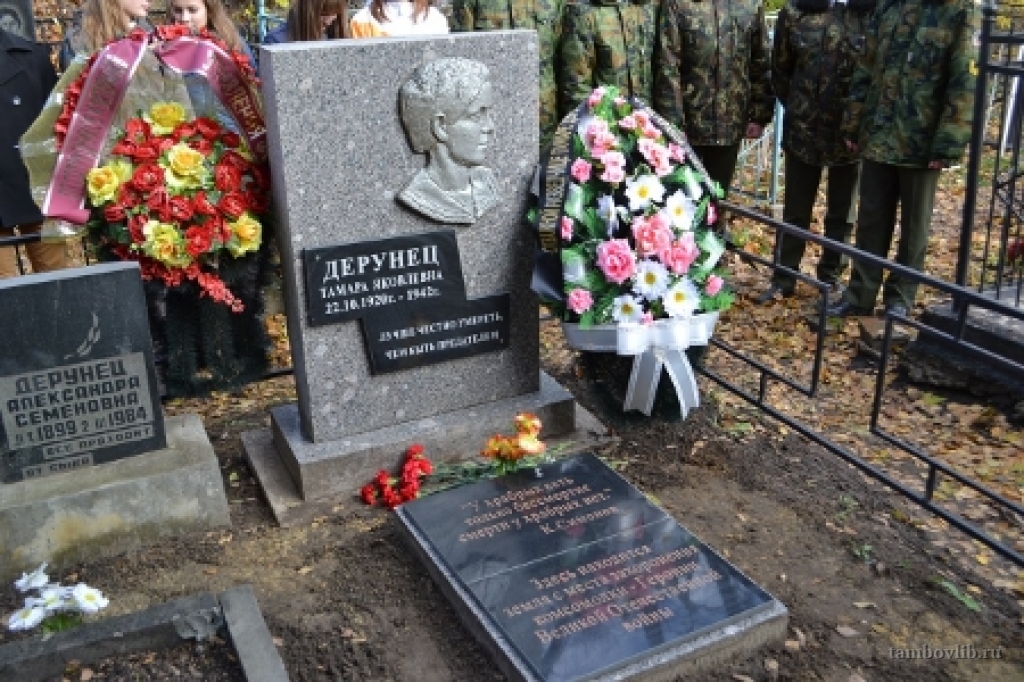 6 мая 2010 года в Тамбове на фасаде областного базового медицинского колледжа была торжественно открыта мемориальная доска, посвященная памяти Тамары Дерунец, преподавателя фельдшерско-акушерской школы (ныне колледж), разведчицы, геройски погибшей во время выполнения задания.На Воздвиженском кладбище областного центра существует символическая могила Тамары Дерунец. Точное место упокоения героини неизвестно, но в Тамбов привезена земля из курских лесов, где погибла наша землячка.