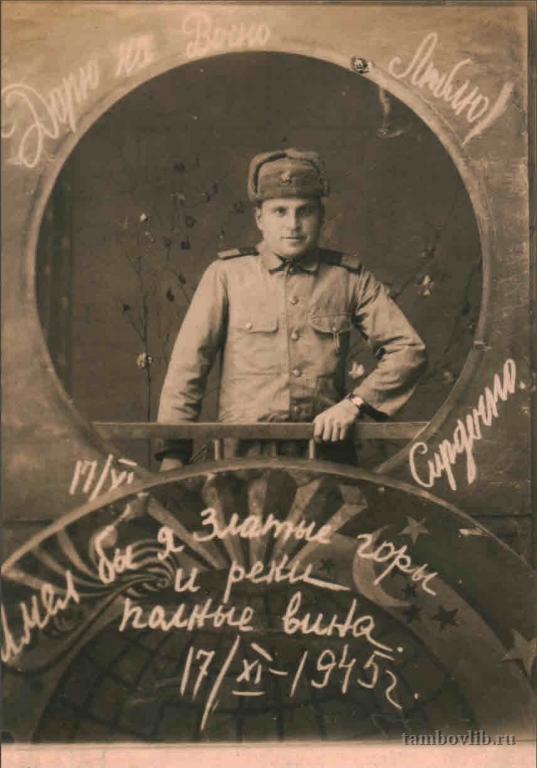 Родился в 1919 г. в с. Дубровка, Юрловский район Тамбовской области. Служил в стрелковом полку Ордена Кутузова 1138 помощником командира стрелкового взвода. Имеет медали «За Отвагу», «За Победу над Германией в ВОВ 1941-1945 гг.», «За Победу над Японией». Умер в 1974 г.17 ноября 1945 ТОУНБ Портрет Бэйань, Хэйхэ, Хэйлунцзян, Китай
