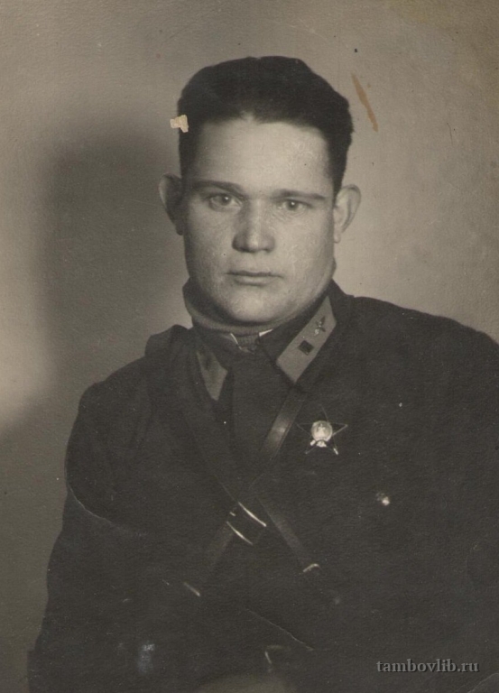 1917г.р., с.Алешки Алешковского района Воронежской области, В РККА с 1938 года, капитан технической службы, на фронте с 22.06.1941г. (Западный фронт и 3 Белорусский фронт). Действуя в тылу врага с сентября по ноябрь 1941 года, принимал активное участие в 4-х боевых операциях. Во время операции в деревне Кукуево проник в расположение противника, забросал его горючей жидкостью и гранатами и лично уничтожил более 10 немцев. Во время этой же операции уничтожил несколько лошадей и повозок с военным снаряжением. 19.12.1941г. награжден Орденом Красной Звезды. Находясь в отряде ООНКВД, действовавшем в тылу врага, показал себя мужественным, смелым командиром. 06.09.1943 награжден Орденом Отечественной войны II степени. В 1944 году за непосредственное участие в обороне Москвы награжден медалью «За оборону Москвы». С 13.08.1943г. по 15.04.1945г. им обеспечено 1204 успешных боевых вылета. Награжден Орденом Красной Звезды 15.04.1945г.Межпоселенческая центральная библиотека Жердевского района Портрет