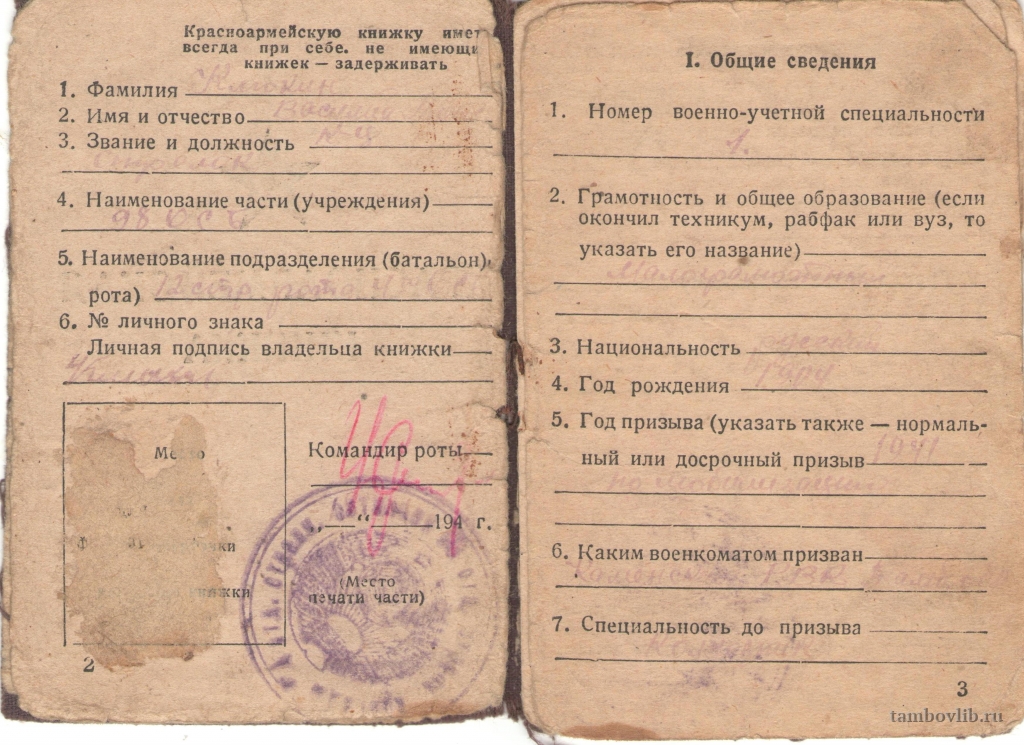 Участник Великой Отечественной войны Клюкин Василий Алексеевич получил красноармейскую книжку в 1941 году. Был ранен и комиссован в 1943 году. Награжден медалью "За отвагу" в мае 1945 года.1941 Межпоселенческая центральная библиотека Ржаксинского района Документ