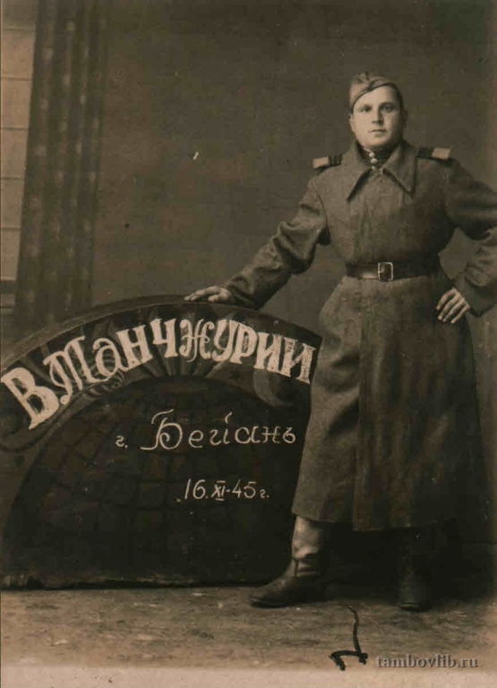 Родился в 1919 г. в с. Дубровка, Юрловский район Тамбовской области. Служил в стрелковом полку Ордена Кутузова 1138 помощником командира стрелкового взвода. Имеет медали «За Отвагу», «За Победу над Германией в ВОВ 1941-1945 гг.», «За Победу над Японией». Умер в 1974 г.16 ноября 1945 ТОУНБ Портрет Бэйань, Хэйхэ, Хэйлунцзян, Китай