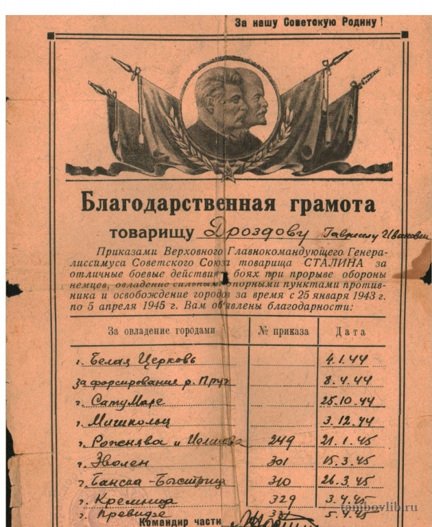 Благодарственная грамота Дроздову Гавриилу Ивановичу