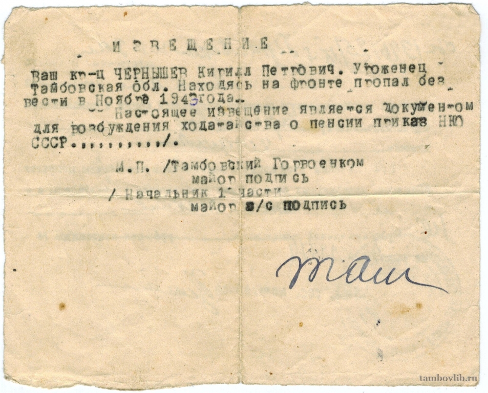 Извещение о без вести пропавшем.
