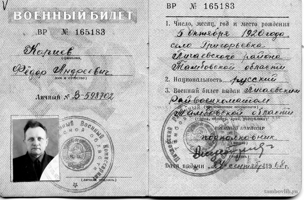 Родился 05 октября 2020 г. в с. Григорьевка Пичаевского района Тамбовской области. В августе 1940 г. был призван Пичаевским райвоенкоматом Тамбовской области в ряды Красной Армии на срочную службу в Закавказский Военный Округ, г. Баку. С 05.10.1940 г. служил рядовым красноармейцем, а затем ефрейтором 513-го Зенитного артиллерийского полка 3-го корпуса ПВО. С мая 1942 по август 1943 г. служил на должностях сержантского состава – командиром орудия 513-го Зенитного артиллерийского полка, входящего в Бакинскую Армию ПВО. Далее – до августа 1945 г. – командиром орудия 2-го дивизиона 130 Отдельной Зенитной Артиллерийской бригады ПВО. Имеет 15 Правительственных наград, в том числе Ордена: «Красной Звезды», «Отечественной Войны II степени». Медали: «За оборону Кавказа», «За боевые заслуги» (2 медали), «За победу Над Германией» и другие. Умер 18 мая 1993 г. в возрасте 72 лет, похоронен в р.ц. Пичаево Тамбовской области.Добавлена 17 Марта 2015