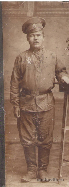 Родился в с. Нижнее Чуево, Мучкапского района, Тамбовской области. Участник Гражданской войны, фото из семейного архива Поповой Валентины Петровны.Центральная библиотека Мучкапского района Портрет