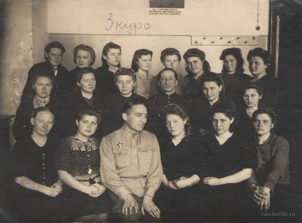 1 ряд (снизу): Елагина М.,Брюнчалина Л.,Зубков М.,Корнаухова А.,Ерошина Н.,Гриднева Р.; 2 ряд: Медведева Т.,Бессонова Н., Жукова Раиса Федоровна,Коган Аб.М.,Горбунова М.,Степанищева С.; 3 ряд: Васильева В.,Пинаева В.,Миронова З.,Васильева З.,Сомова М.,Ненашева Р.,Попова М.,Воронова В. Фото предоставлено дочерью Жуковой Р.Ф. Пуляевой Валентиной Владимировной.1948 Межпоселенческая центральная библиотека Жердевского района В тылу Тамбов, Тамбовская область, Россия