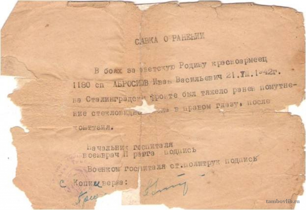 Абросимова Ивана Васильевича, ветерана Великой Отечественной войны.21 августа 1942 Межпоселенческая центральная библиотека Пичаевского района Документ