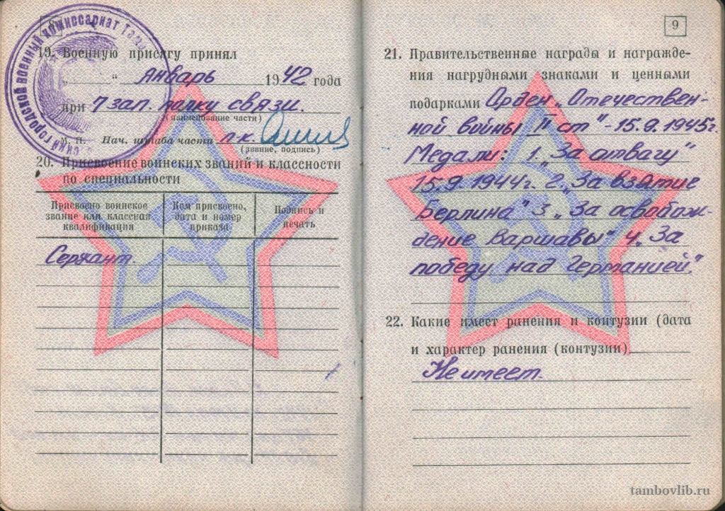 Родился 8 января 1923 г. в д. Гвоздевка Кирсановского района Тамбовской области. Был призван на фронт в ноябре 1941 г. Служил в 1387 зенитном артиллерийском полку, был командиром орудия, сержант. Награждён орденом «Отечественной войны II степени», медалью «За Отвагу», медалью «За взятие Берлина», медалью «За освобождение Варшавы», медалью «За победу над Германией». Умер 16 апреля 1979 г.