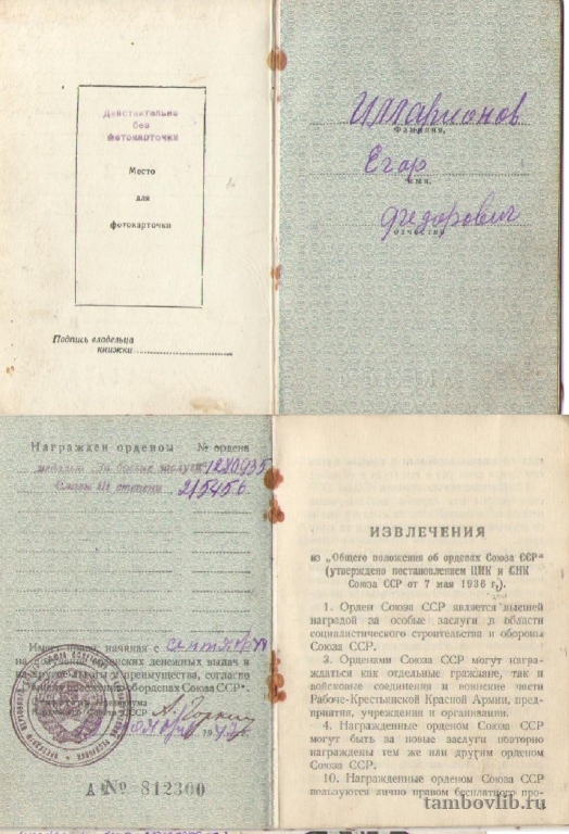 Орденская книжка Илларионова Егора Федоровича, 1903 г.р.