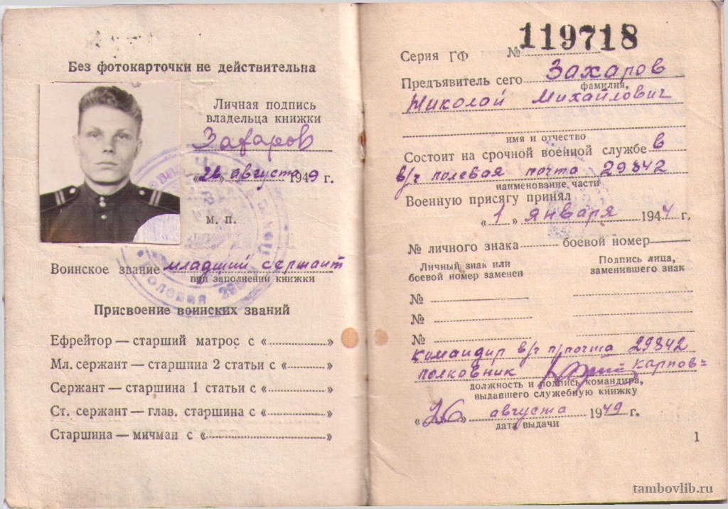 Захаров Николай Михайлович, с. Пичаево26 августа 1949 Межпоселенческая центральная библиотека Пичаевского района Документ