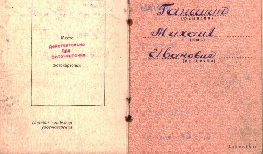 Удостоверение к медали Ганьшина Михаила Ивановича