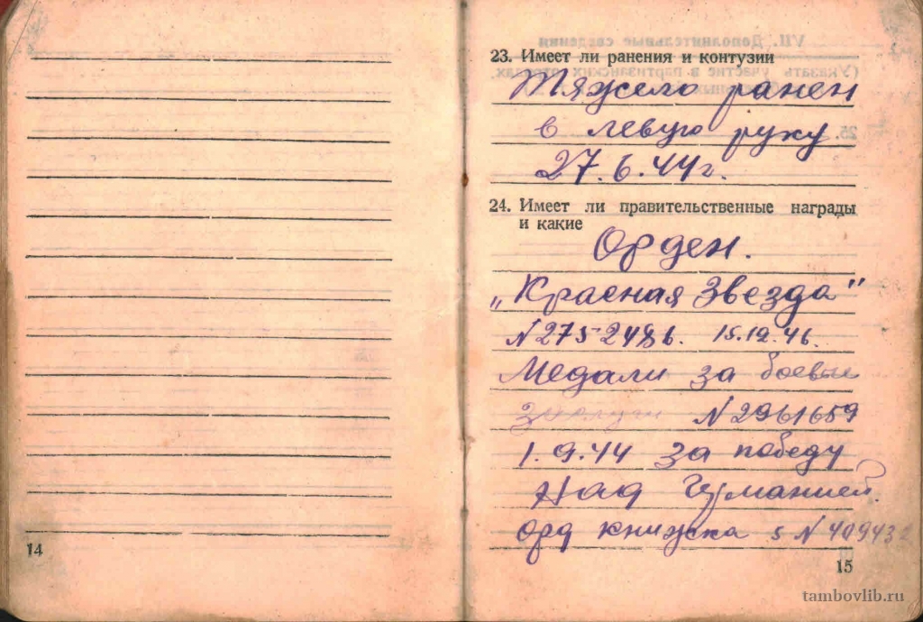 Родился 5 марта 1912 г. в д. Телешовка Платоновского района Тамбовской области. 15.10.1934 г. Бондарским РВК призван в ряды Красной Армии и далее зачислен в запас. В 1940 г. переехал на заработки на Дальний Восток. Призван по мобилизации Шмаковским РВК Уссурийской области и зачислен в 277 отдельный батальон сапёром в 1941 г. Далее службу продолжал в должности стрелка в 36 отдельной стрелковой бригаде. В 1944 г. был ранен и уволен по ранению в запас. Награждён орденом «Красной Звезды», медалью «За боевые заслуги», медалью «За Победу над Германией», а также в ознаменование 40-летия Победы в ВОВ награждён орденом «Отечественной войны II степени» и юбилейными медалями. Умер 25 мая 1996 г. На фото Военный билет.Добавлена 7 Апреля 2015