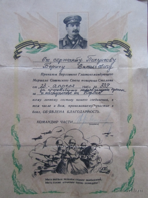 Приказом Верховного Главнокомандующего Маршала Советского Союза товарища Сталина от 23 апреля 1945 года №339 за прорыв обороны немцев западнее Одессы и наступление на БерлинМежпоселенческая библиотека Рассказовского района Документ