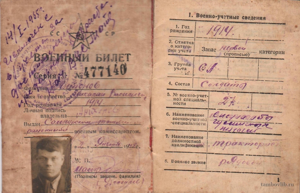 Антонов Николай Васильевич родился в 1914 году в с. Павловка Сампурского района Тамбовской области. Призван в армию в июне 1941 года. Воевал в составе 488 артиллерийского полка, 13 Гвардейской артиллерийской пушечной бригады, в должности тракториста. Рядовой. Награжден медалями "За отвагу", "За боевые заслуги", "За оборону Москвы", "За взятие Кенигсберга". Демобилизован 25 сентября 1945 года. Умер в 1986 году.02 января 1948 Знаменская ЦБС Документ