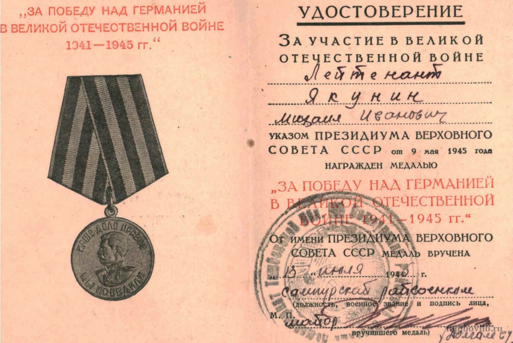 Удостоверение к медали "За победу над Германией в Великой Отечественной войне 1941-1945 гг." Якунина Михаила Ивановича