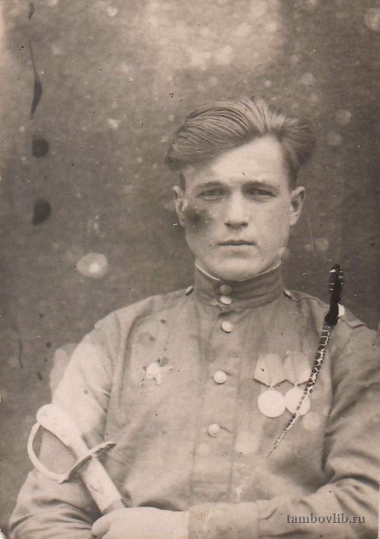 Родился в с. Глебовка Сараевского района Рязанской области 13 июня 1924 года. На фронт был призван в августе 1942 года. Был стрелком, помощником командира взвода, командиром взвода. Дошел до Германии. Был трижды ранен. Имеет награды: Орден Красной Звезды, 2 медали "За отвагу", медаль "За взятие Кёнигсберга", "За победу над Германией в Великой Отечественной войне в 1941-1945 гг." После Победы приехал в р.п.Знаменку Тамбовской области, работал в "Сельхозтехнике" водителем. Скончался 17 марта 1982 года. Фото из семейного архива Кулешова Александра Петровича.Добавлена 14 Апреля 2015