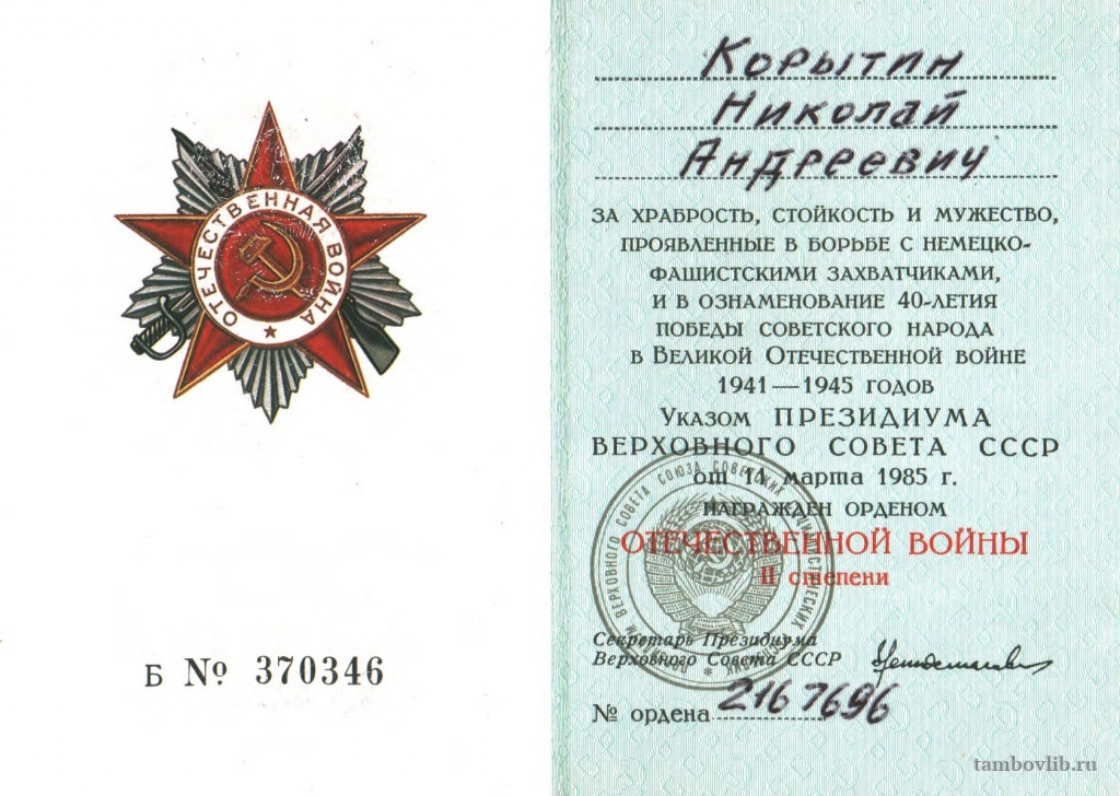 Родился 25 октября 1924 г. в с. Мучкап Мучкапского района Тамбовской области. Окончив 10 классов в 1941 г. был направлен в Тамбовское артиллерийское военное училище. Окончив его в сентябре 1942 г., лейтенантом был направлен на фронт. Воевал в составе 338 стрелковой Неманской Краснозанаменной дивизии. В мае 1945 г. участвовал в штурме и взятии Кенигсберга, затем был переброшен на Дальний Восток и участвовал в боевых действиях против Японских империалистов. После войны остался служить в Красной Армии на Дальнем Востоке и в звании подполковника был уволен в запас в 1975 г. За героизм и мужество в годы Великой Отечественной войны Корытин Н.А. был награжден Орденом Отечественной войны II степени, Орденом Красной Звезды, медалями «За боевые заслуги», «За победу над Германией в Великой Отечественной войне 1941-1945 гг.», «За взятие Кенигсберга», «За победу над Японией», «За освобождение Монголии» и многочисленными юбилейными медалями (15 штук)Добавлена 15 Апреля 2015