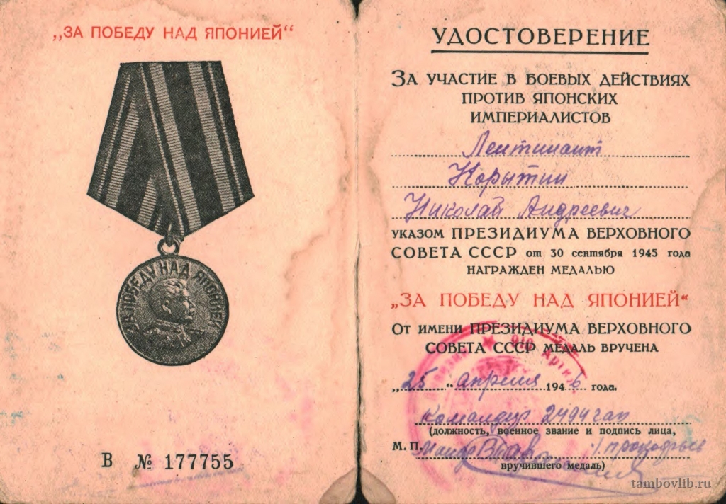 Удостоверение к медали "За победу над Японией" Корытина Николая Андреевича