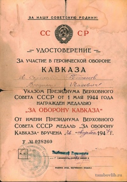 Родился д. Орловка Тамбовского района Тамбовской области в 1918 г. Призван в ряды Советской армии в 1939 г. Служил в 92-м Гвардейском Корпусном Артиллерийском Николаевском полку. Был ранен при защите Ленинграда в апреле 1942 г. После излечения продолжал службу в том же полку с августа 1942 г. по апрель 1945 г. В апреле 1945 г. был ранен. В августе 1945 г. был демобилизован в связи с ранением. Награжден медалью «За оборону Кавказа», «За боевые заслуги», юбилейными медалями. После войны работал трактористом на разных предприятиях г. Тамбова. Умер в 1990 г.Добавлена 19 Апреля 2015