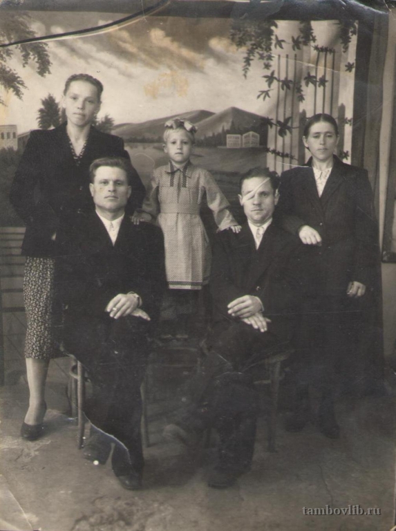Семьи братьев Филипповых: слева - Александр Иванович с женой Екатериной Ивановной, справа - Петр Иванович с женой Серафимой Александровной и дочерью Валентиной. Петр Иванович Филиппов (15.08.1920 - 17.03.2005) - участник Великой Отечественной войны. Родился в с. Екатеринополье Инжавинского района. Был призван в армию в 1942, демобилизован в 1944 году. Младший сержант, связист.После войны вернулся в Инжавинский район. Филиппова Серафима Александровна родилась 18 декабря 1918 года. Участница трудового фронта. Во время войны работала в Инжавинском районе в колхозе имени Калинина. Вязала носки бойцам на фронт, работала в поле. На быках возила зерно на инжавинский элеватор. Не раз зимой в метель приходилось ночевать в поле в стогах соломы. Фотография предоставлена дочерью, жительницей р. п. Инжавино Глуховой (Филипповой) Валентиной Петровной.Межпоселенческая центральная библиотека Инжавинского района Семейное
