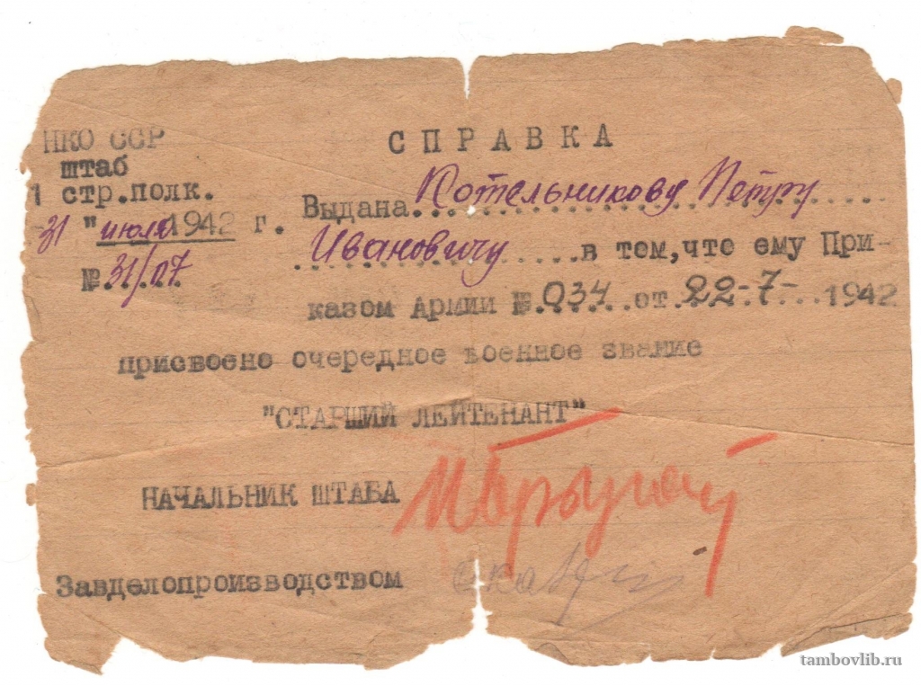 Справка выдана Котельникову Петру Ивановичу, в том что ему Приказом Армии от 22 июля 1942 года присвоено очередное военное звание "Старший лейтенант".