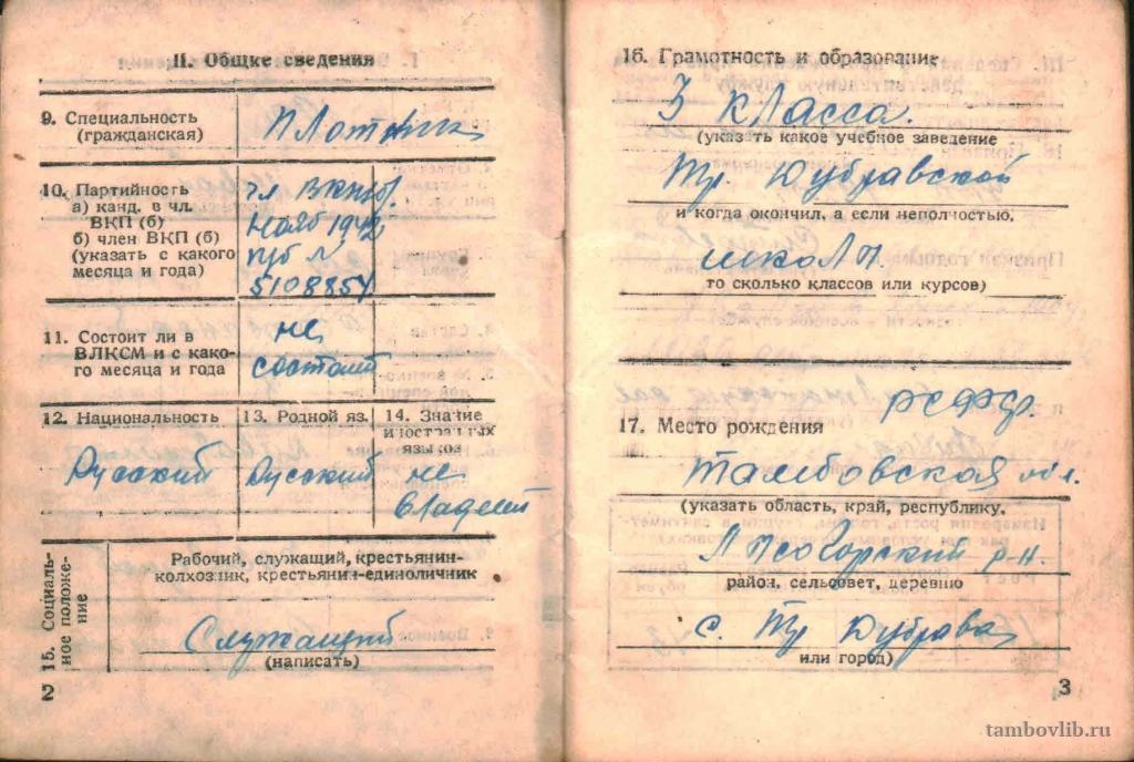 Родился в 1901 г. в с. Троицкая Дубрава Лысогорского района Тамбовской области. Образование 3 класса. Работал до войны плотником в колхозе. С 1920-1924 гг. участник Гражданской войны в Туркестане, 6 отдельная Алтайская кавалерийская бригада РККА. На фронт был призван Лысогорским РВК в августе 1941 г. Служил в 323 стрелковой дивизии под командованием подполковника И. А. Гарцева. Первое боевое крещение принял под Москвой 6 декабря 1941 г. в ходе Тульской наступательной операции Московской битвы в качестве разведчика конного взвода. Участвовал в обороне Москвы, взятии городов Епифань, Сухиничи, Брянск, форсировании р. Друть, взятии городов Бобруйск, Белосток, прорыве на р. Висла, вступлении в Брандербургскую провинцию и наступлении на Берлин. Награждён орденом «Красной звезды», двумя медалями «За отвагу», медалями «За оборону Москвы», «За освобождение Варшавы», «За взятие Берлина», «За победу над Германией в ВОВ 1941-1945 гг.». Мобилизован в августе 1945 г. старшим сержантом, командиром отделения конников роты автоматчиков 1086 стрелкового Краснознаменного полка 323 стрелковой Брянской Краснознамённой ордена Суворова II степени дивизии. Умер 28.07.1956 г. На фото Военный билет.Добавлена 29 Апреля 2015