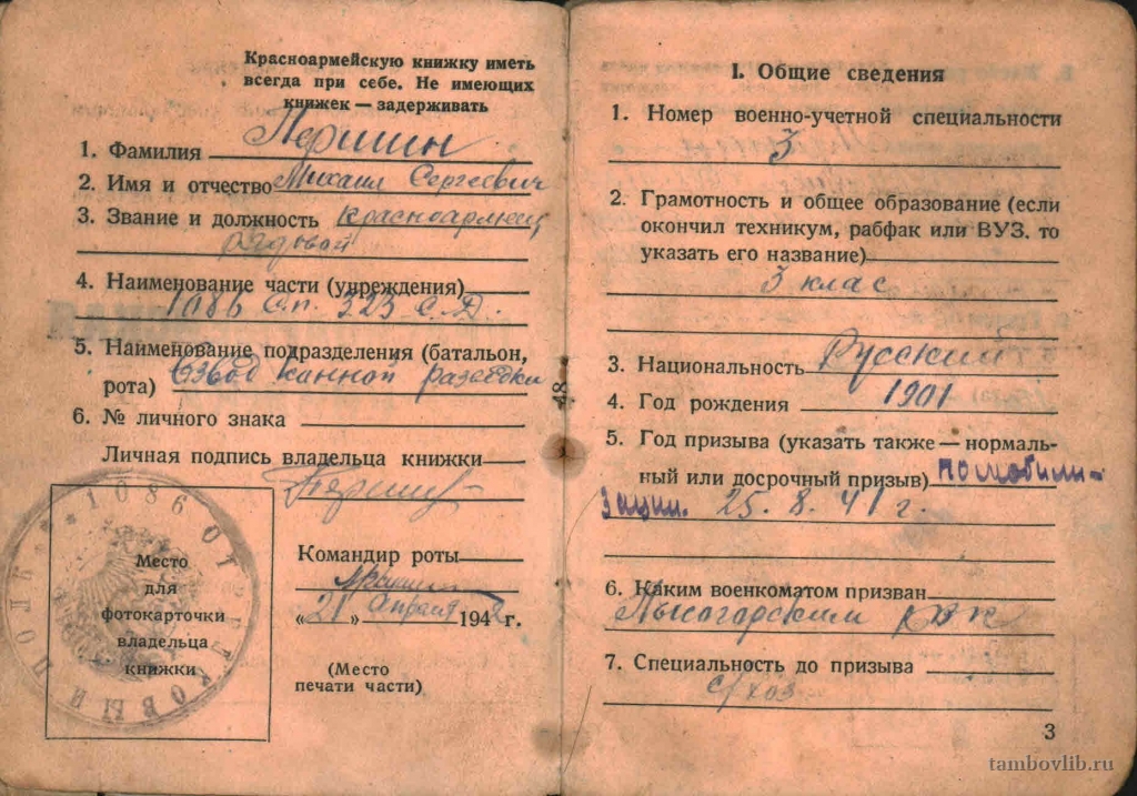 Родился в 1901 г. в с. Троицкая Дубрава Лысогорского района Тамбовской области. Образование 3 класса. Работал до войны плотником в колхозе. С 1920-1924 гг. участник Гражданской войны в Туркестане, 6 отдельная Алтайская кавалерийская бригада РККА. На фронт был призван Лысогорским РВК в августе 1941 г. Служил в 323 стрелковой дивизии под командованием подполковника И. А. Гарцева. Первое боевое крещение принял под Москвой 6 декабря 1941 г. в ходе Тульской наступательной операции Московской битвы в качестве разведчика конного взвода. Участвовал в обороне Москвы, взятии городов Епифань, Сухиничи, Брянск, форсировании р. Друть, взятии городов Бобруйск, Белосток, прорыве на р. Висла, вступлении в Брандербургскую провинцию и наступлении на Берлин. Награждён орденом «Красной звезды», двумя медалями «За отвагу», медалями «За оборону Москвы», «За освобождение Варшавы», «За взятие Берлина», «За победу над Германией в ВОВ 1941-1945 гг.». Мобилизован в августе 1945 г. старшим сержантом, командиром отделения конников роты автоматчиков 1086 стрелкового Краснознаменного полка 323 стрелковой Брянской Краснознамённой ордена Суворова II степени дивизии. Умер 28.07.1956 г. На фото Красноармейская книжка.