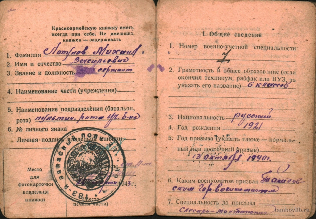Родился в 1921 г. в с. Красносвободное Тамбовского района Тамбовской области. Призван в 1939 г. Тамбовским РВК Тамбовской области. Был зенитчиком. После ранения в 1943 комиссовали. Награждён орденом «Отечественной войны I степени». Умер в 2013 г. На фото Красноармейская книжка.Добавлена 29 Апреля 2015