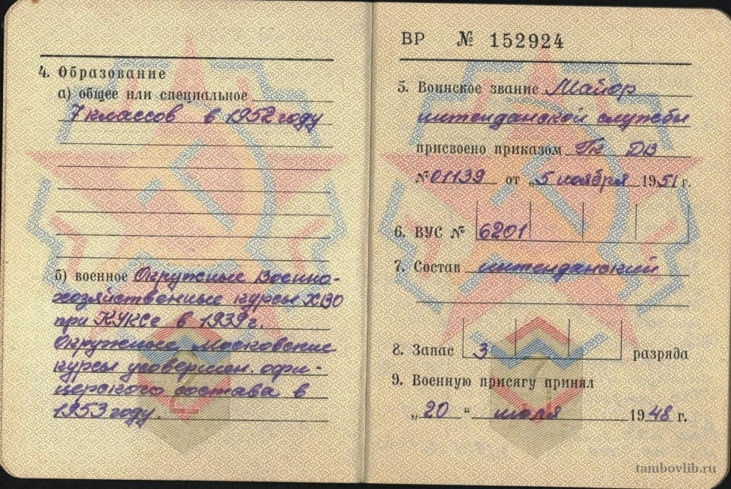 Родился 25 сентября 1913 г. в с. Адамовка Щорского района Днепропетровской области. Был призван в ряды армии 20 октября 1935 г. Участие на фронтах Великой Отечественной войны с июня 1941 по июнь 1944 гг. Южный Сталинградский, 4-й Украинский фронта с июня 1941 по июнь 1944 гг. в должности помощника и начальника отдела склада НКО. В послевоенные годы служил в г. Харькове, на Сахалине, в Тамбове. Демобилизован 29 ноября 1958 г. Награжден орденом «Красной Звезды», орденом «Отечественной войны I степени», медалью «За боевые заслуги», юбилейными медалями. Умер 18 сентября 2006 г. На фото Военный билет.Добавлена 8 Мая 2015