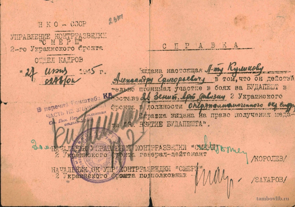 Родился 2.02.1921 г. в г. Тамбове. С 1940 по 1941 гг. служил красноармейцем в 151 полку войск НКВД. С 1941 г. - лейтенант, командир взвода 264 стрелкового батальона 48 стрелковой дивизии, Волховский фронт. В 1942 г. два раза был ранен, контужен. Адъютант командира 41 бригады, Ленинградский фронт. С 1943 по 1945 гг. - оперуполномоченный отдела контрразведки «СМЕРШ» Главного управления 2-го Украинского фронта (Зенитный артиллерийский полк). В 1946 г. демобилизован. Умер 10.02.2003 г.Добавлена 14 Мая 2015
